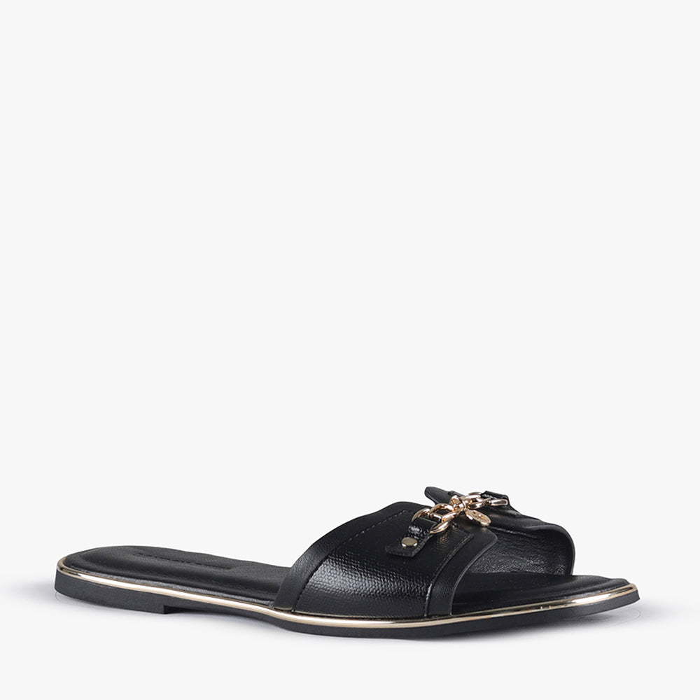 A stunning flat slide sandal with luxurious gold trim. Slip into style and comfort with this must-have accessory. Perfect for any occasion, Micky will elevate your look while keeping you comfortable all day long. Make a statement with every step in these trendsetting sandals.